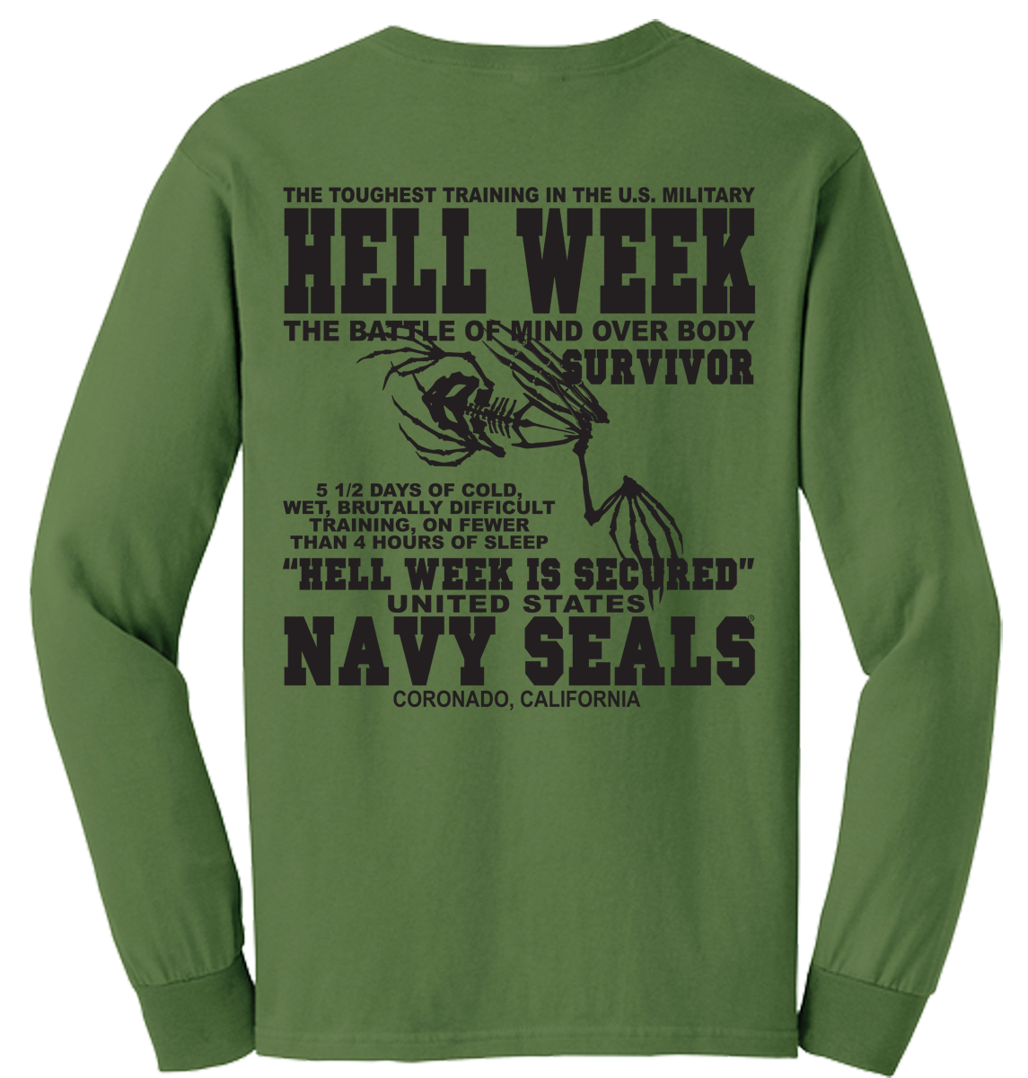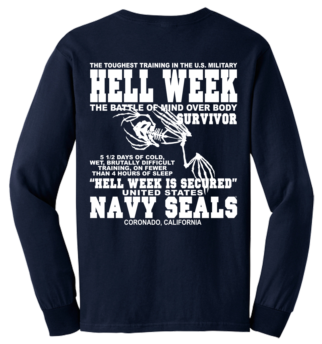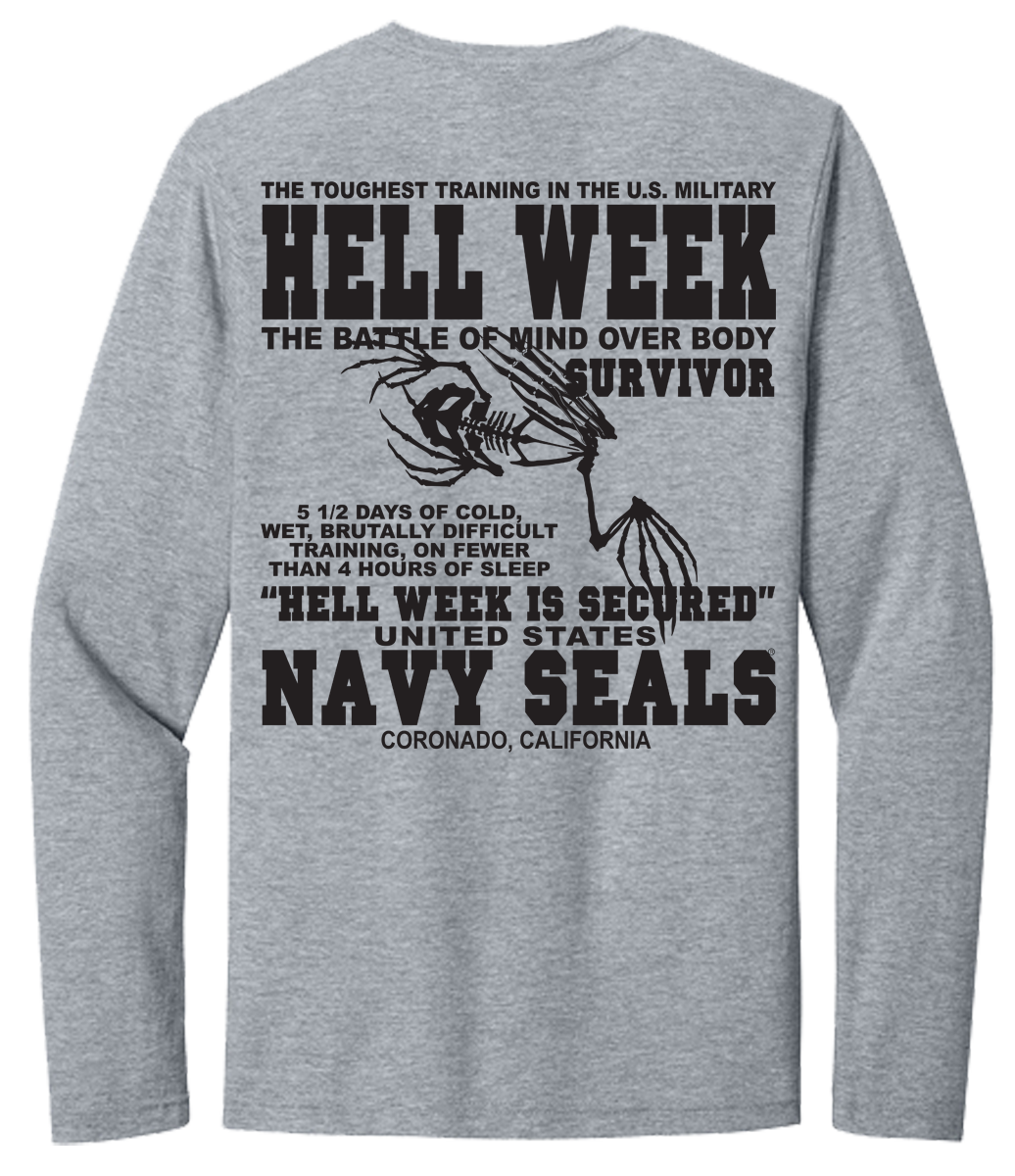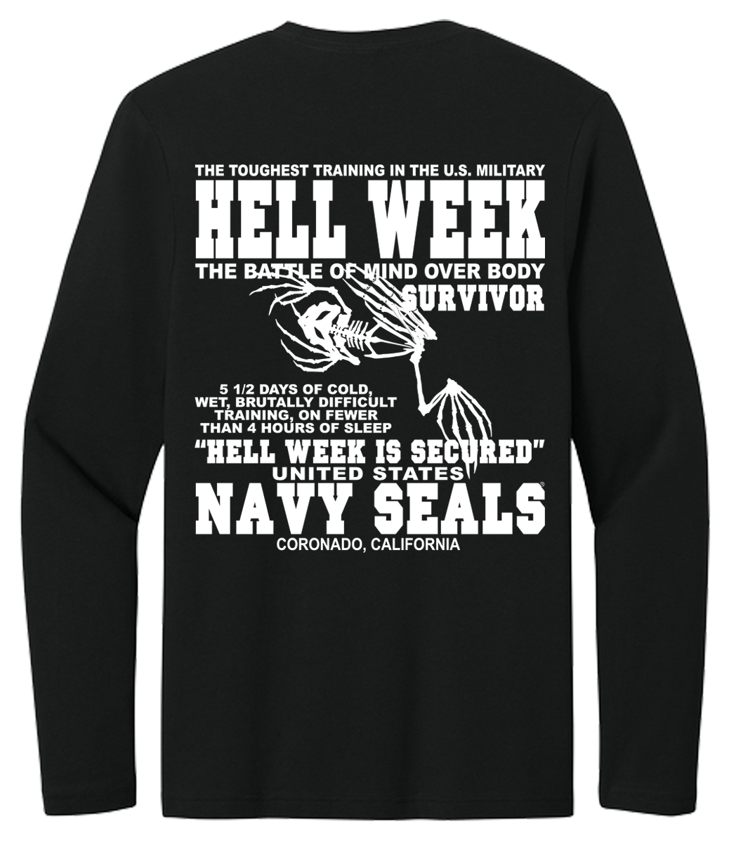 Hell Week is the defining, 5½-day, notoriously brutal crucible in the first phase of U.S. Navy SEAL BUD/S training that tests, and breaks, most candidates. Occurring in the third week, it involves constant, freezing, and sandy, high-intensity, operational, training on less than 4 hours of total sleep. Only ~25% typically survive. You will love this Hoodie!