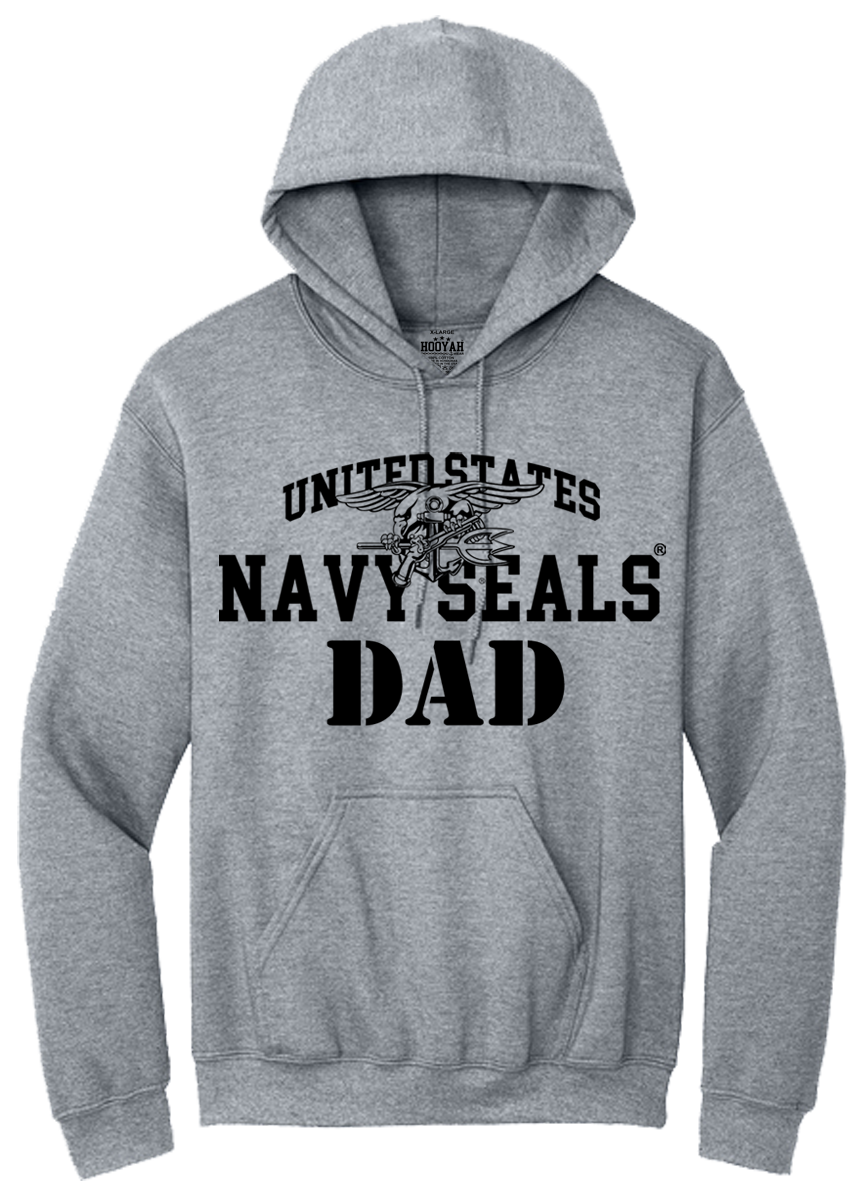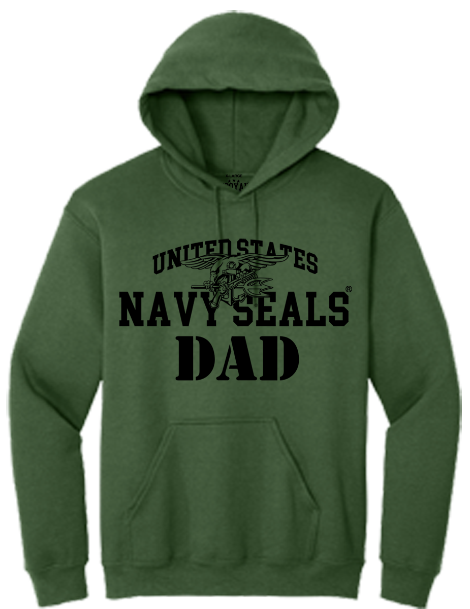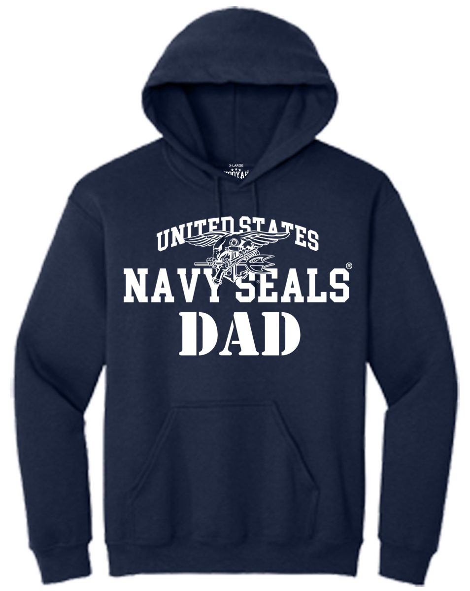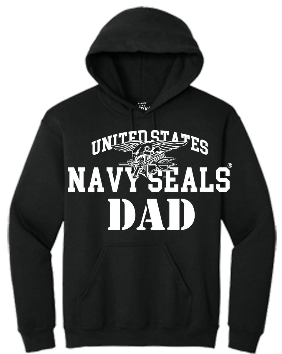 This is a soon to be classic Navy SEALs design. On this Hoodie, the Trident Seal is superimposed over the lettering: “United States Navy SEALS”, with the word: “Dad” below in a nice Military Stencil font. This is a great Hoodie for any proud Navy SEAL dad! A garment he will be proud to wear. Great for wearing on most any occassion when the weather is a little too cool for just a t-shirt. Wear it with pride Dad!