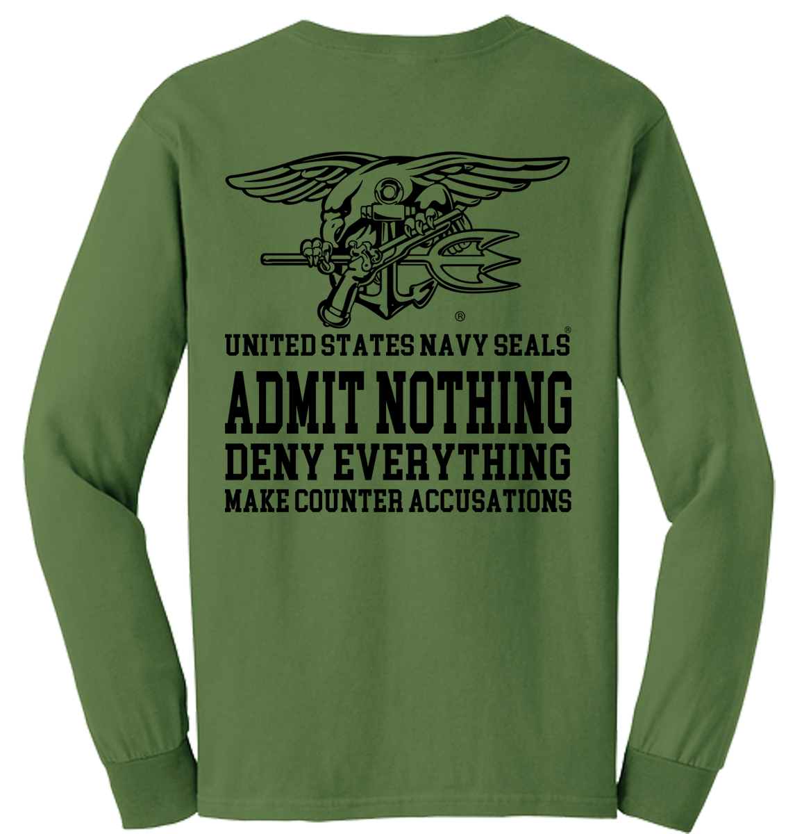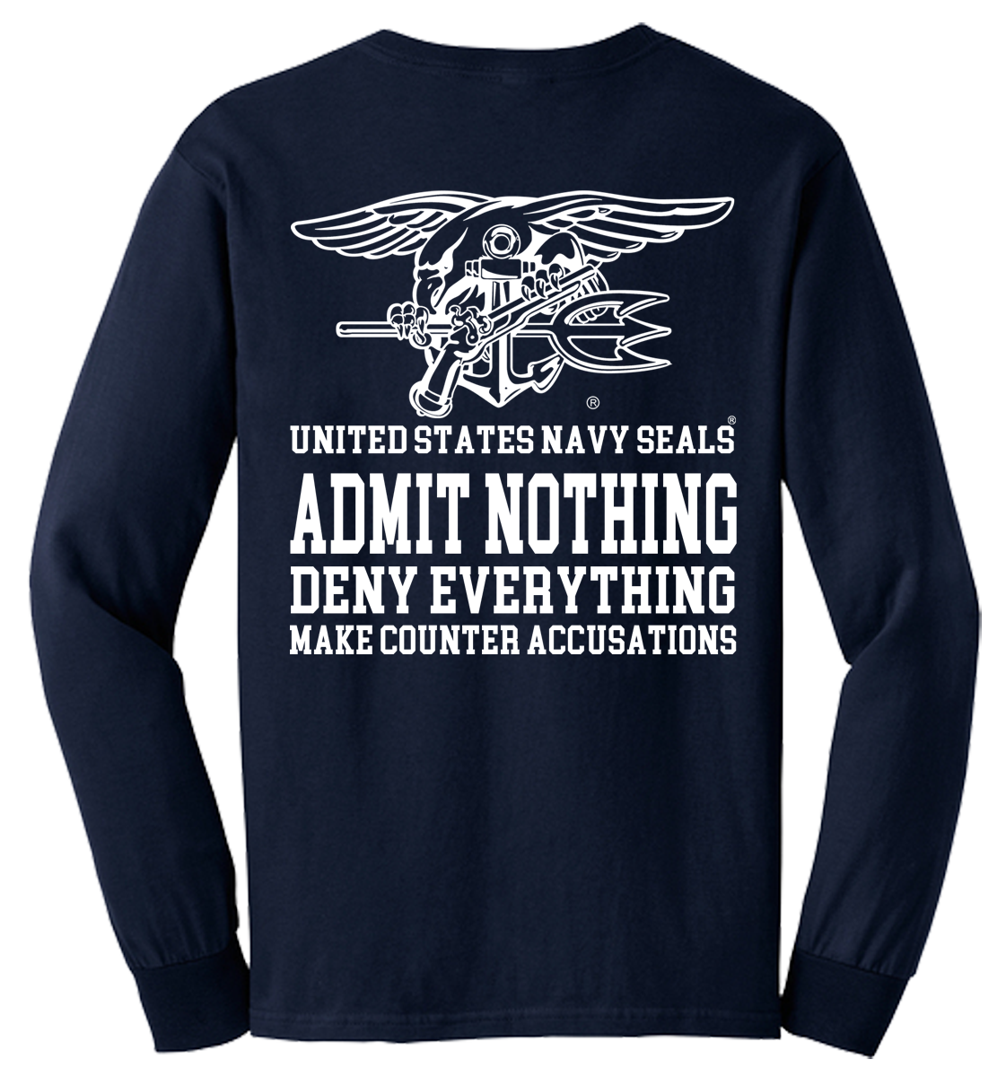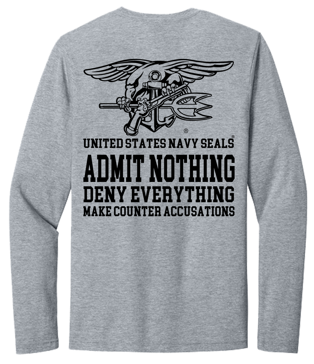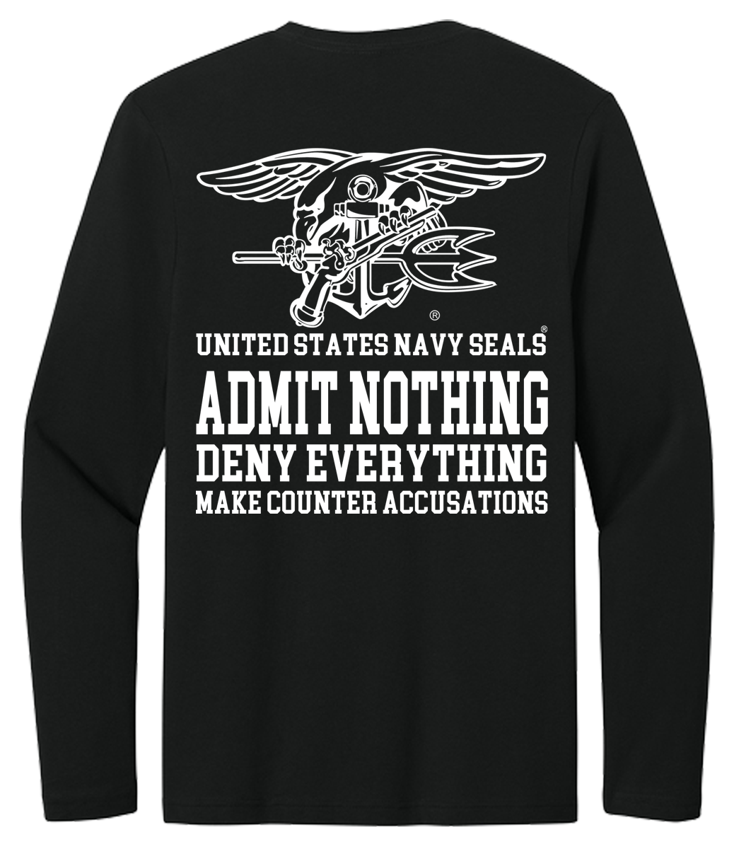 This is a classic quote from the Navy SEALs. It about protecting your interests and reputation while minimizing potential damage. In this design The Seals Trident sits above the quote: “Admit Nothing, Deny Everything, Make Counter Accusations” the lettering: “United States Navy SEALS”. A t-shirt you will be proud to wear. Great for wearing on most any occassion.